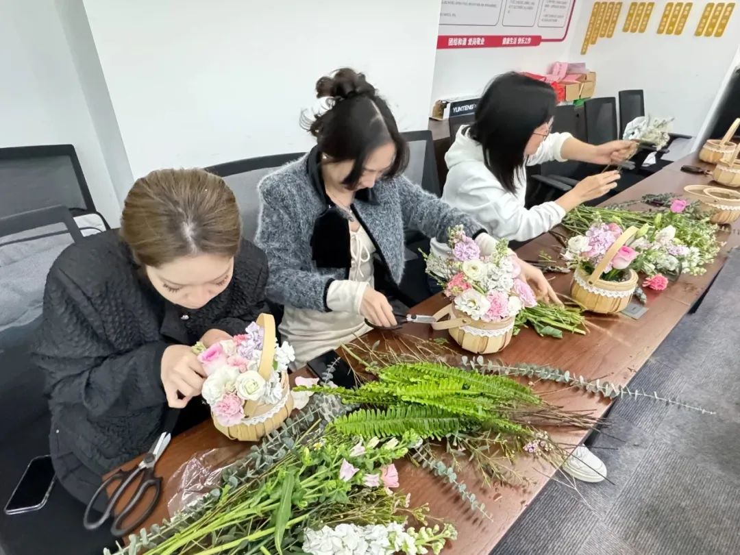 活动邀请花艺师为大家介绍插花的基本知识、鲜切花日常养护知识与所用花材的简介,帮助女职工们深入了解花艺美学,并利用现有花材为大家示范了插花的技法与搭配原理。随后大家在老师带领下开始动手实践,根据材料和主题,发挥着想象力和创造力制作自己的花艺作品,体验制作花艺的乐趣和成就感。