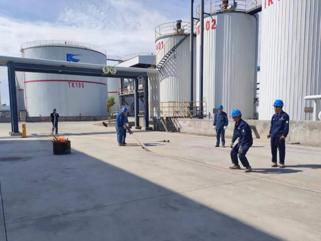演练开始前,生产部经理向员工们详细讲解了消防器材使用方式,演示了消防灭火器、消防栓及消防水带等消防器材的使用方式,并组织员工进行消防水带抛接练习。演练模拟了火灾初起及发展阶段,教授员工如何使用手提式干粉灭火器进行灭火,让每一位员工亲自体验了如何正确使用灭火器,以及发生火灾时如何采取应急措施。最后模拟库区沥青储罐着火,指导他们根据消防应急预案进行应急灭火工作,检验了员工对应急火情的处置能力。