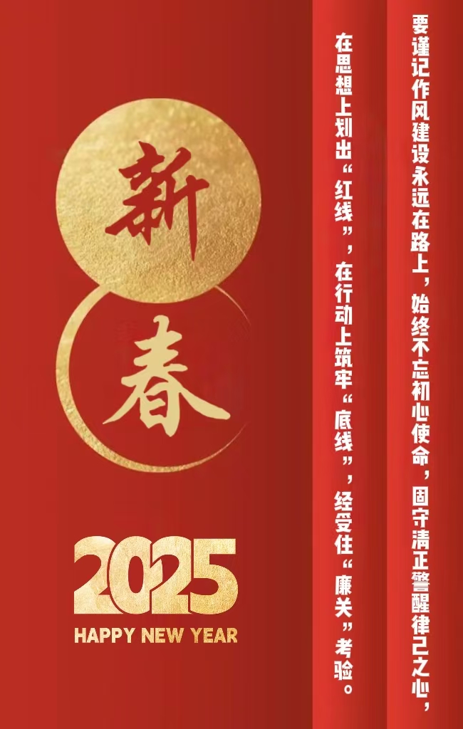 为不断落实中央八项规定及其实施细则精神,严防节假日期间“四风”问题反弹,英国威廉集团官网纪委特发出廉洁提醒:全体干部员工在节庆之余,应严格遵守中央八项规定精神和廉洁自律各项规定,牢记纪律“高压线”、不触制度“红线”、守住做人底线。在模范遵守纪法的同时管好自己的家属和子女,时刻绷紧纪律规矩这根弦,做到守规矩、知敬畏、过“廉”节。最后,恭祝大家新春快乐、身体健康、阖家幸福、好运连连!