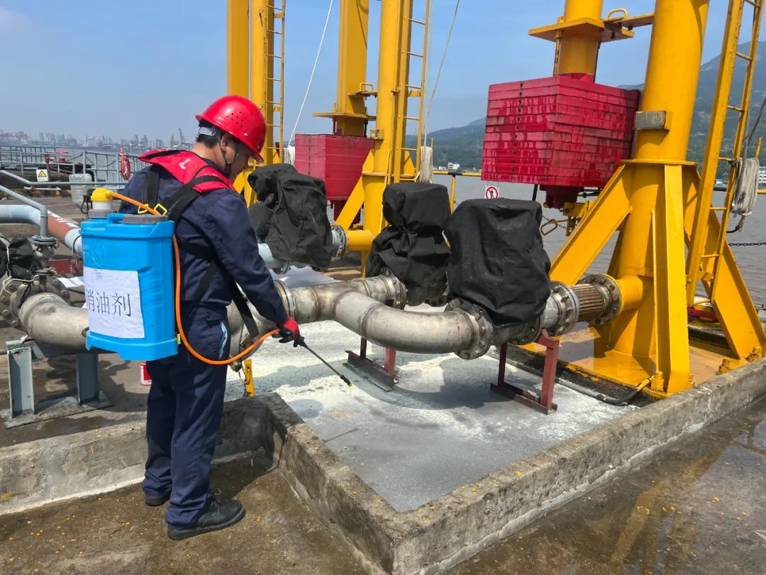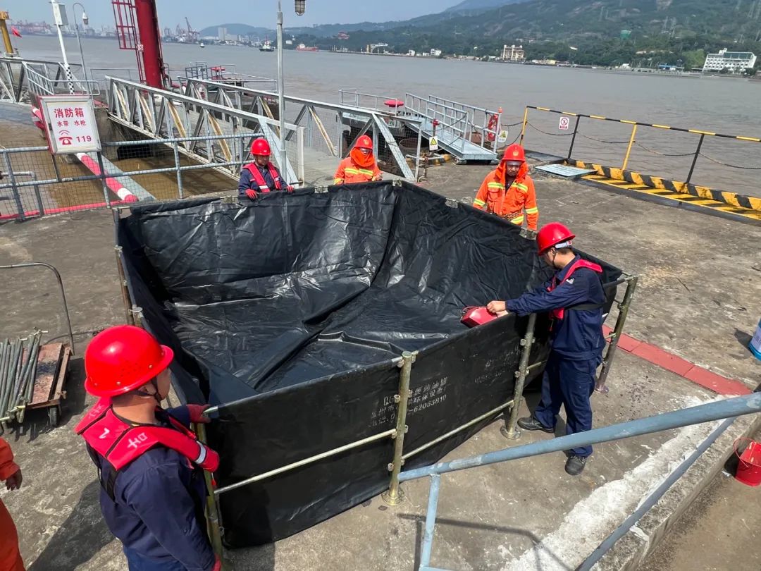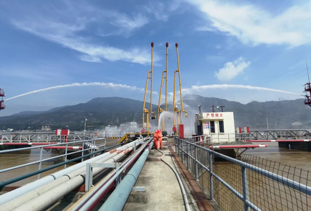 演练前期通过“桌面推演+实地预演”精心筹备,主要内容包括模拟巡检员在码头前沿发现阀门泄漏,立即上报并抢修;抢修中因不规范器具导致静电起火,初期扑救无效后启动消防应急预案;火情扑灭后,针对江面和平台污染物启动防泄漏预案处置。