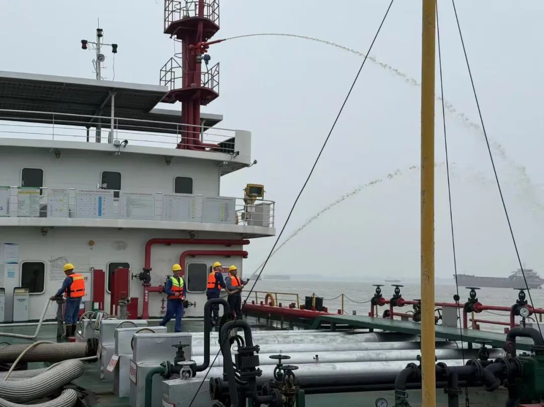 演练开始前,总指挥详细讲解情景设计、目的和要求,并下达演习指令。事故模拟一艘卸货沥青船因线路老化导致生活舱起火,火势迅速蔓延;沥青船立即停止作业自救,并向码头求援,其间一名船员在救火中手臂烫伤,公司随即启动人身伤害处置预案进行救治。演练强化了各岗位应急处突能力,增强了全员安全意识。