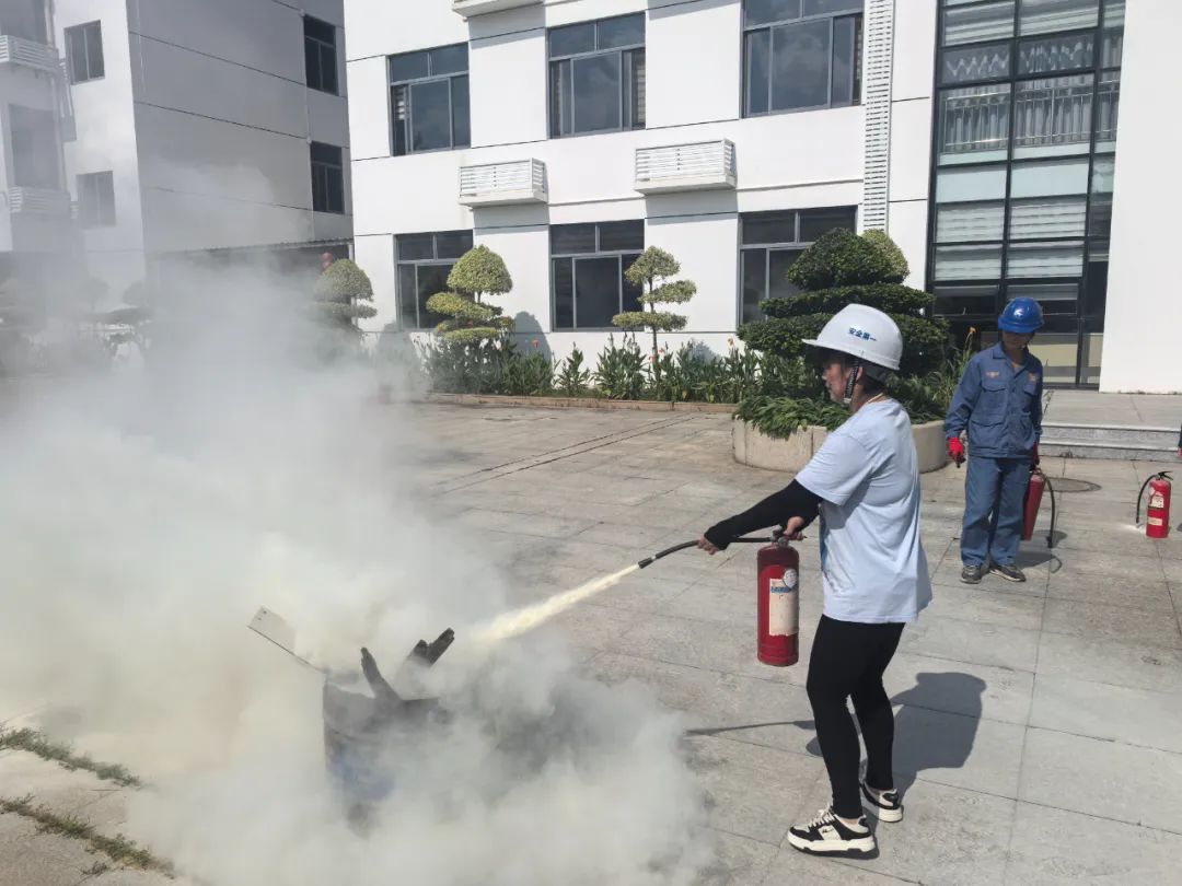 演练现场,环安部负责人通过理论讲解与实物演示,详细介绍器材使用要点:针对干粉灭火器,强调“一提、二拔、三握、四压”口诀,即提起灭火器、拔掉保险销、握住喷管前端、压下压把,并提醒保持安全距离对准火焰根部扫射;对于灭火毯,演示快速展开覆盖火源隔绝氧气,并结合沥青生产模拟小型油类起火场景,直观展示器材适用差异。