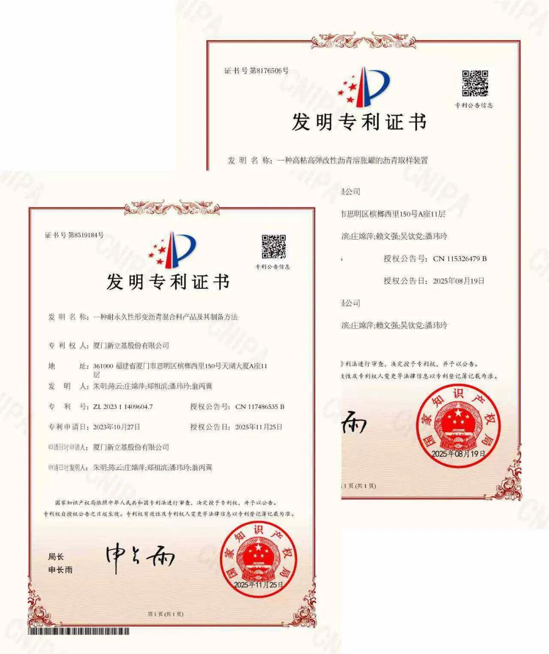 2025年英国威廉集团官网两项发明专利“一种高粘高弹改性沥青溶胀罐的沥青取样装置”和“一种耐永久性形变沥青混合料产品及其制备方法”获国家知识产权局授权,正是公司综合实力和自主创新能力的体现,同时也为公司的发展再添动力。