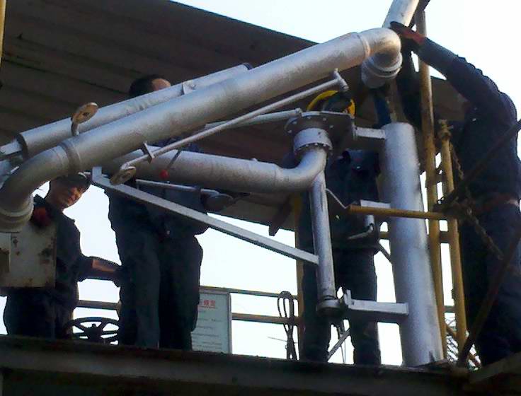 2013年3月7日至8日生产部对改性沥青发车平台更换发车鹤管。 使用挖掘机将新鹤管吊上发车平台进行组装,延长发车沥青管道连接鹤管。