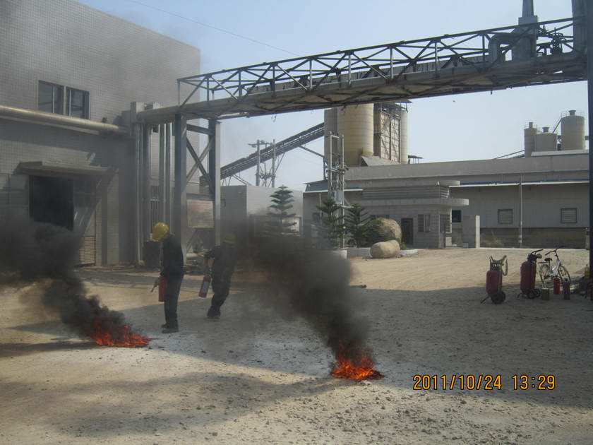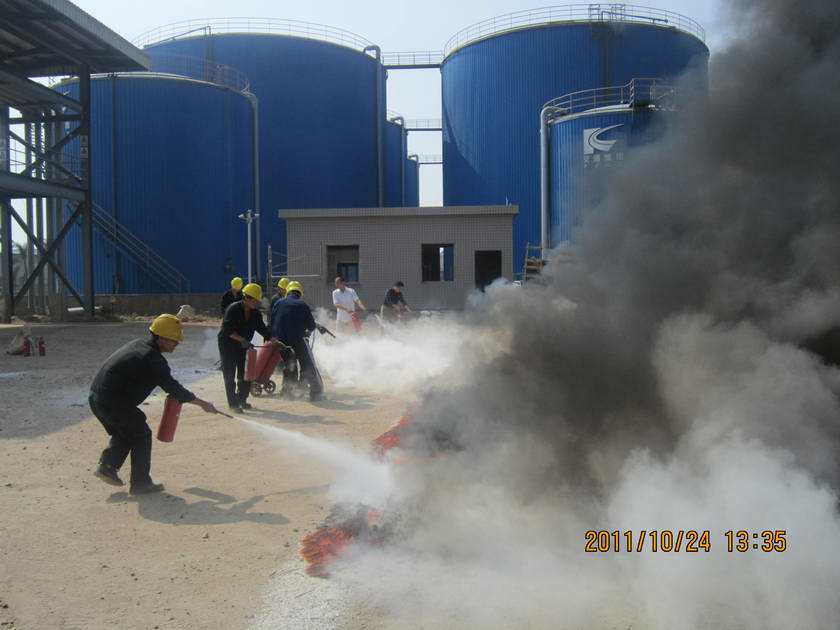 2011年10月24日,在漳州新立基沥青有限公司副总经理叶永杰的带领下,各部门员工在角美库区开展了紧张有序的个人灭火、SBS重大火灾现场灭火及消防灭火等演练。