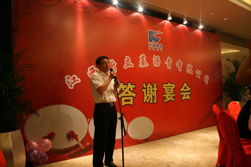 中午十二点,江西新立基沥青公司答谢宴会在信华建国大酒店隆重举行。刘小健董事长发表了热情洋溢的祝酒辞!刘董事长表示福建交通集团将一如既往地支持交投公司在江西等地的以沥青、化工为主业的项目!他要求江西新立基公司沥青化工项目坚持又好又快的原则,科学安排、精心组织、扎实推进,争取早出成果、早见成效!刘董事长祝各位来宾、各位同仁及江西新立基全体干部员工身体健康!工作顺利!阖家幸福!