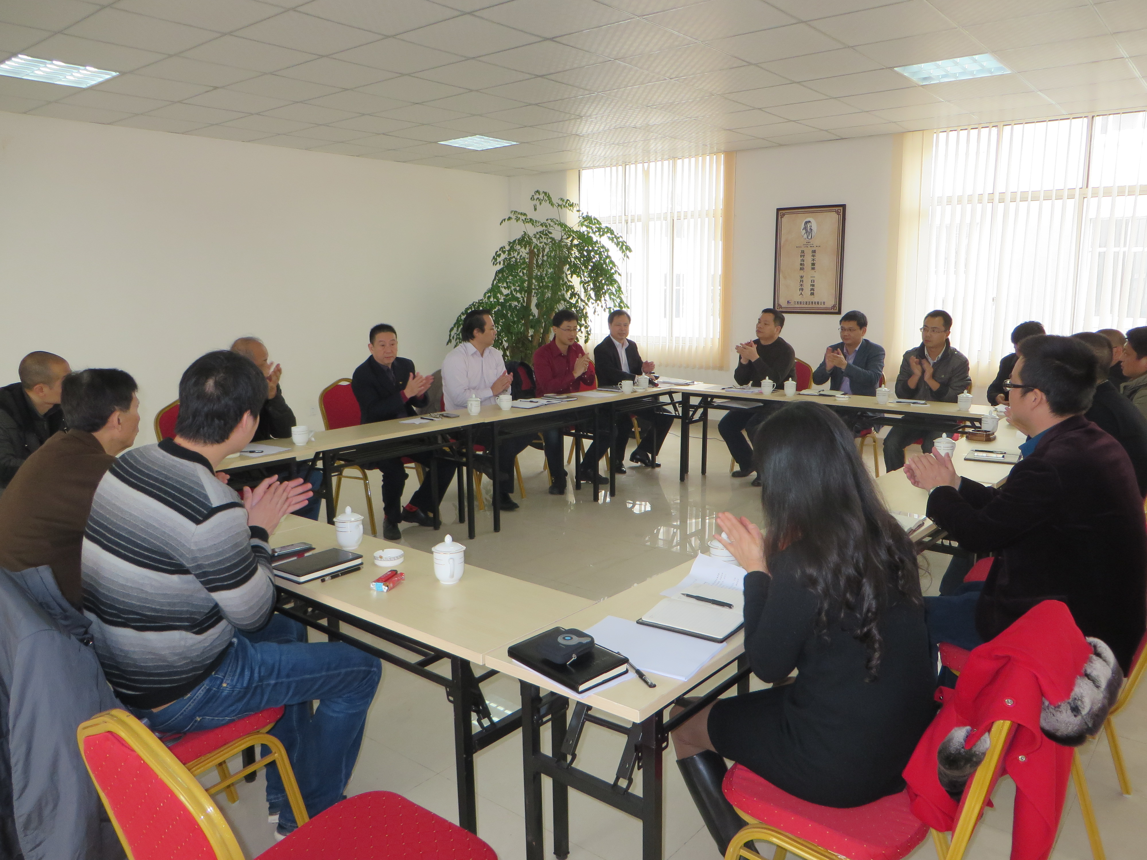 2015年3月17日至18日,福建省交通建设投资有限公司总经理郭辉、综合办主任余振波在英国威廉集团官网董事长朱勇进的陪同下,对江西新立基沥青有限公司开展调研考察,3月17日上午组织召开了江西新立基中层以上干部会议。