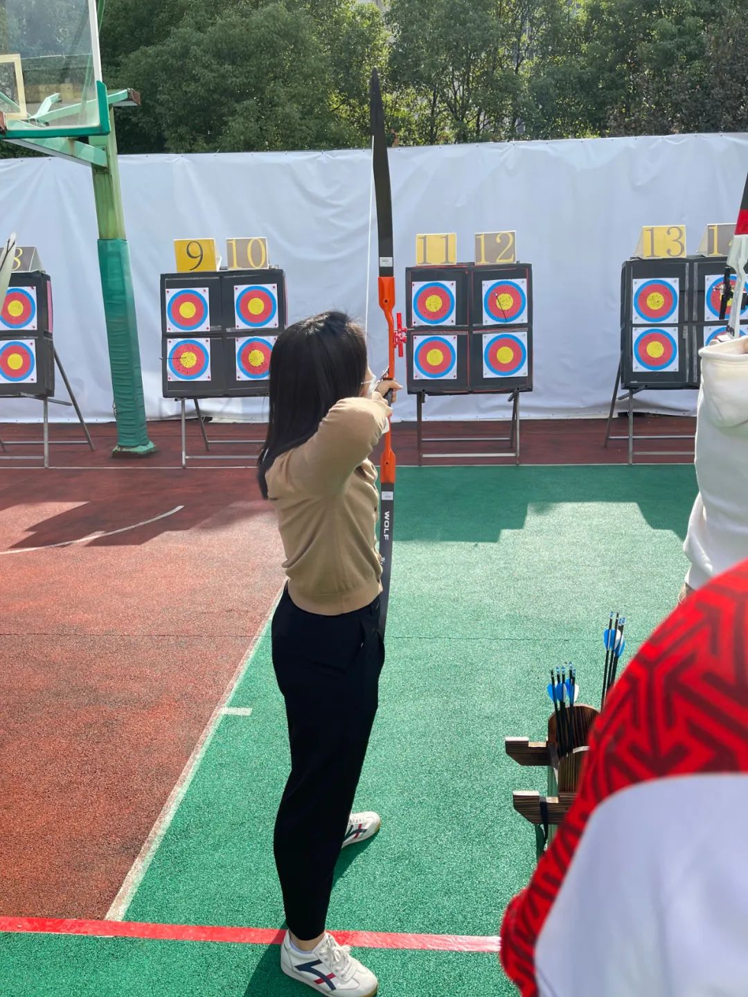 射箭作为中华传统“六艺”之一的文体项目,近几年悄然兴起,区别于跑跳等激烈运动,射箭更需参与者沉着专注、端正心态。第一次拿起专业弓箭,方知看似容易做实难。参赛队员在职业教练的指导下进行赛前训练。现场专业教练向参赛的队员们耐心地告知瞄准要领,悉心地调整队员的拉弓姿势,经过初步训练和两轮模拟赛之后,比赛正式开始。三名队员目光如炬、聚精会神;全神贯注、奋力拼搏。搭箭、扣弦、预拉、开弓、瞄准、撒放,他们仿佛穿越到了古代,成为了赛场上的勇士,为了集体的荣誉,在比赛中都射出了较满意的环数,享受到了从箭矢搭弓到箭头射入标靶所带来的乐趣。